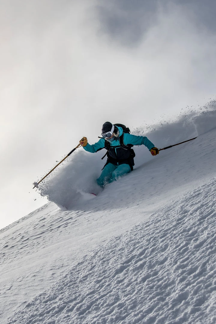 We’ve always made our women’s gear as tough and durable as the men’s gear, but the Domino Jacket is next level. This simplified, super-lightweight shell, made with eVent DV Expedition fabric, was built for the backcountry. It’s got heaps of air permeability that’ll let you go as far as your legs will take you. With 20K waterproofing and a zip-out powder skirt, it’ll weather the storm. Underarm vents cool you down on a climb and ample pockets store snacks for the summit and can be accessed even while wearing a backpack.