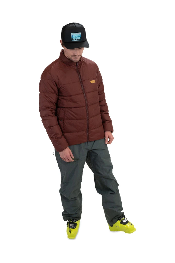 This is not a ski jacket, per se. (Although we give you full permission to wear it skiing.) Mostly, it’s an everyday insulated jacket that skiers will love and wear whenever they’re on or off the mountain. It has warm down insulation, a heavy-duty front zipper, and a relaxed around-town look that offers technical functionality for colder days. Two big hand pockets with functional snaps stash your stuff and a small leather patch on the chest gives you just the right amount of flare.