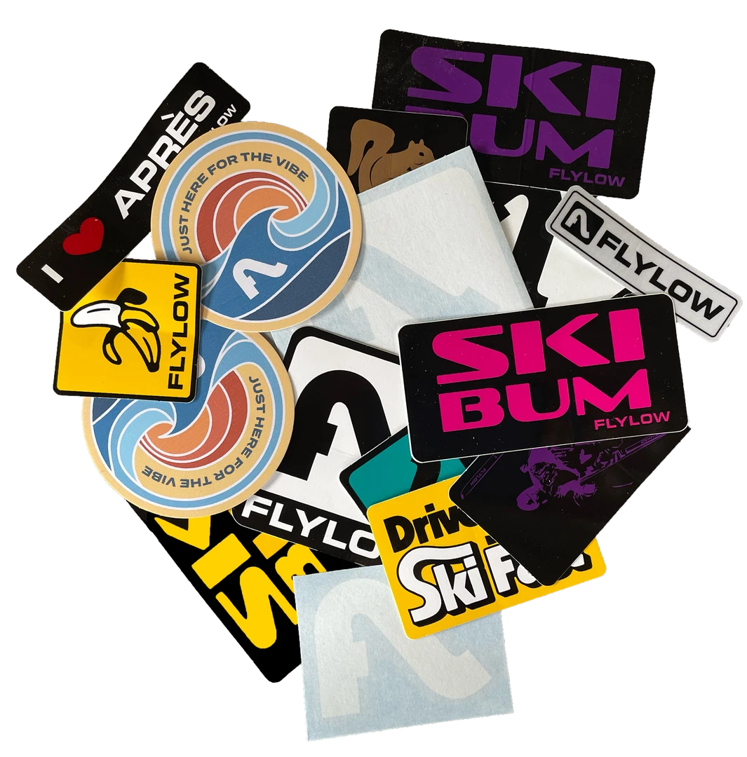 A mixed bag of decals, funky Flylow graphics and logo stickers.Â